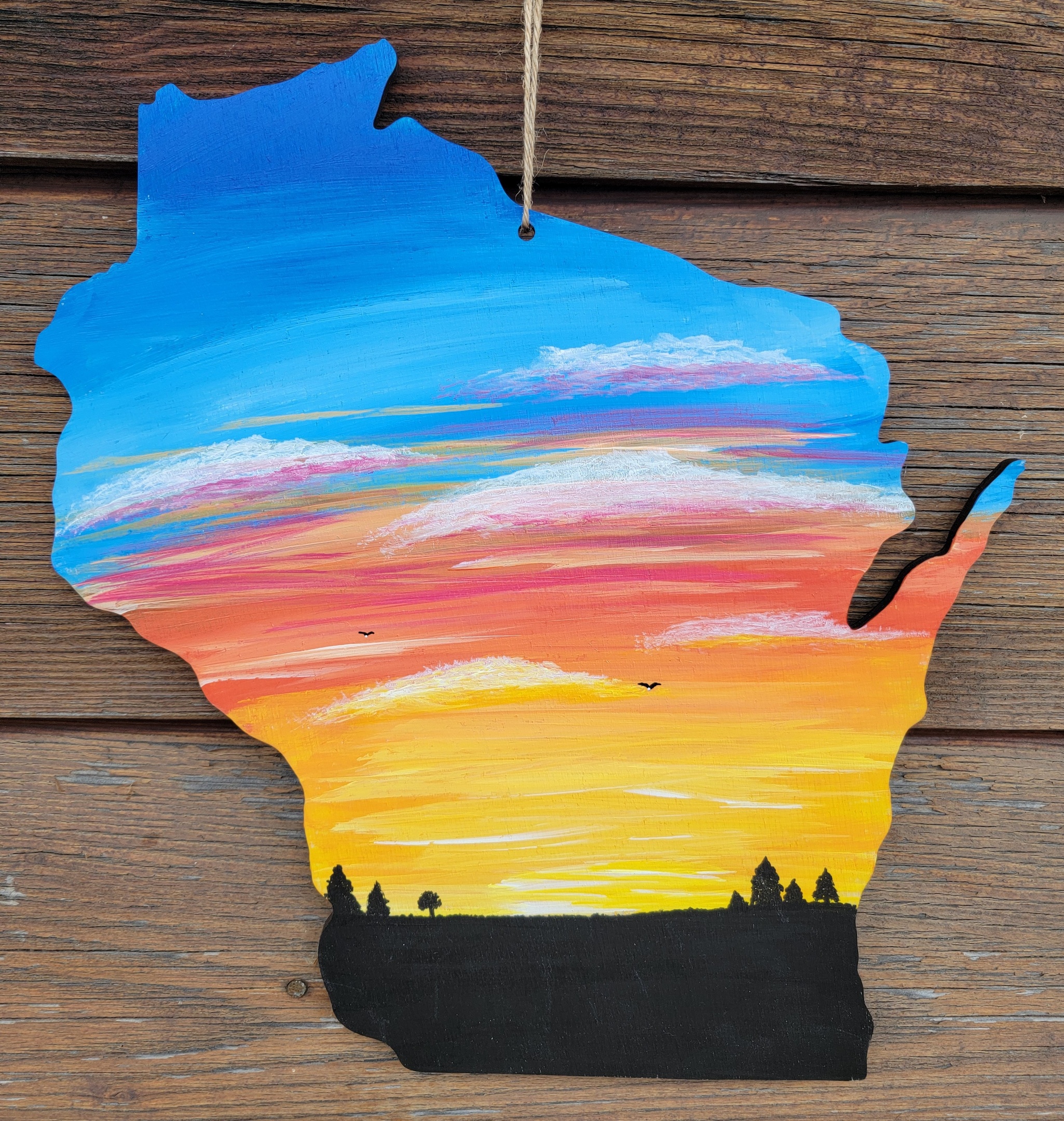 Class max is 20 people and approx 2 hours. I will walk you through this fun, easy sunset painting on a 12" Wood WI or 13" Wood MN!! It can be in whatever colors you choose! No experience necessary. Let me know you are coming with friends so you sit together! When you sign up, let me know if you want WI or MN. Sign up by Calling: 715-349-5169, Email: jellybeanascp@gmail.com, Facebook Messenger or Pay Ahead By Clicking Here. (If you pay ahead and cannot make the class your payment will be put on a Jellybeana's Gift Card)