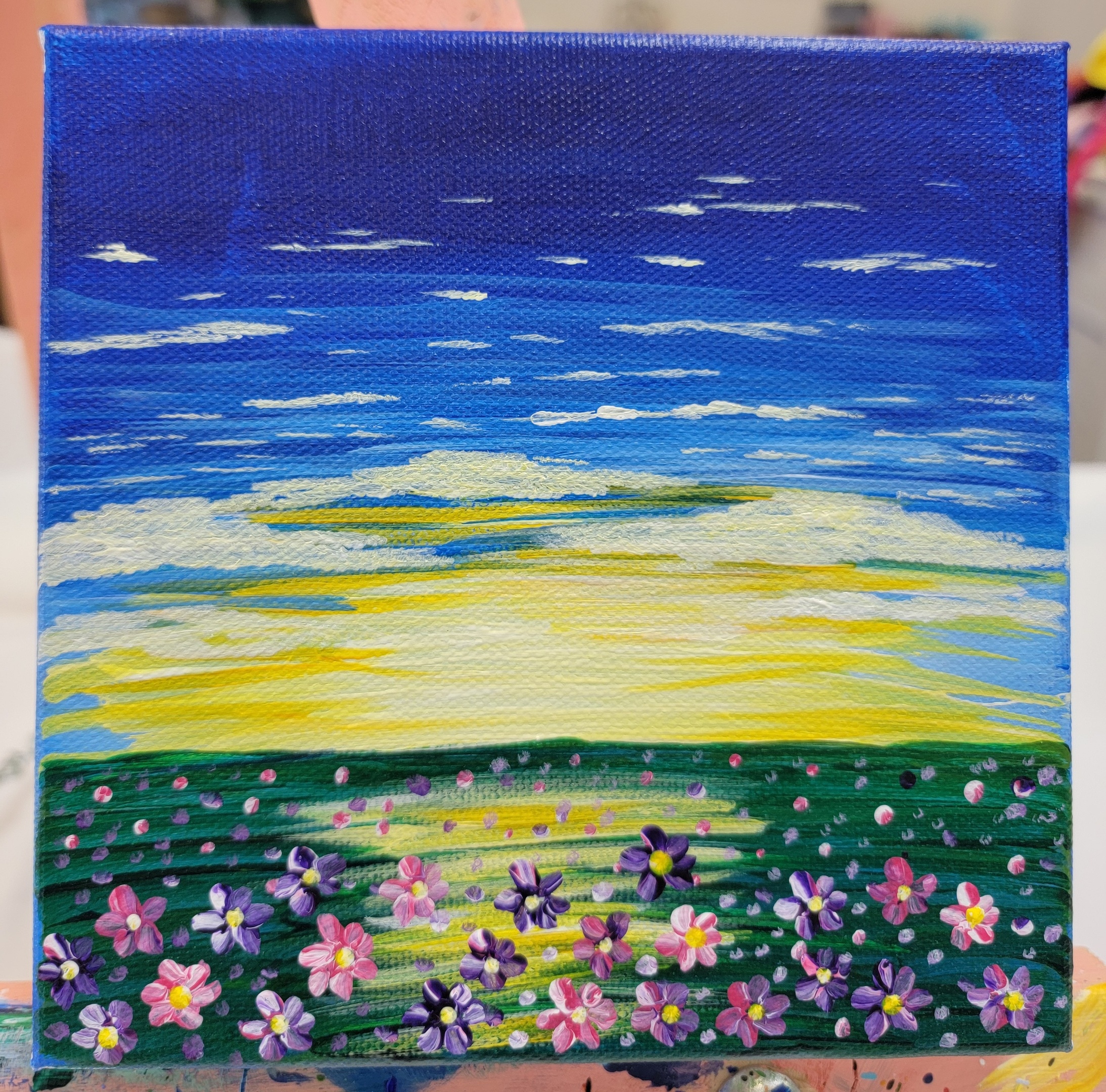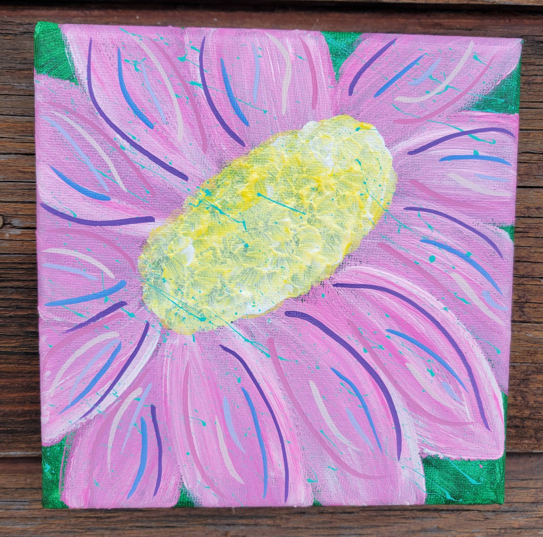 Class max is 15 people and approx 1 hour. We are painting the daisy on an 8x8 canvas, then using paint pens, and last splattering. I will help and instruct as we go. This will be in whatever colors they choose! Sign up by Calling: 715-349-5169, Email: jellybeanascp@gmail.com, Facebook Messenger.